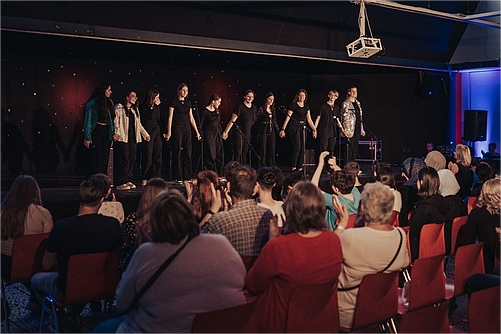 Zwischen den zwei Aufführungen sorgten unsere ukrainischen Schülerinnen Sofia, Daria und Maria für einen Gänsehautmoment, als sie in ihrer Muttersprache ihr Lied über eine Zukunft sangen, die nicht zu planen ist.