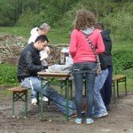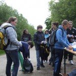 Auch wenn Regenschirme und Kapuzen öfter mal zum Einsatz kamen, war die gute Laune aller Beteiligten ungetrübt. Die Streckenposten aus den 10. Klassen genossen die frische Waldluft und zeigten zuverlässig, wo es lang ging. Die Helfer des Sanitätsdienstes standen immer dort bereit, wo ein Pflaster oder auch nur Zuspruch notwendig wurde. In der Sporthalle sorgten die Gruppencoaches für unterhaltsame Betreuung der Kinder, die auf den Schulbus warten mussten. Eltern und Lehrer verpflegten die Kinder großzügig mit frisch zubereitetem Obst und Getränken. Prima, dass sie dabei sitzen konnten. Bänke und Tische hatte die Familie Koch bei der Feuerwehr in Rommerskirchen leihen dürfen und auch an Ort und Stelle auf- und abgebaut.
