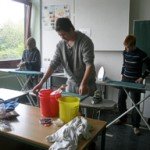 Während die eine Gruppe in der Küche eine Mahlzeit zubereitete und den Tisch mit Servietten dekorierte, waren andere mit Rollenspielen zum Thema „Typisch männlich, typisch weiblich?“ beschäftigt oder wurden in die Geheimnisse des Bügelns, Fensterputzens und Knöpfchen Annähens eingeweiht. Dabei war auch manch ein Pflaster nötig. Originalton Herr Müser: „Du musst den Knopf an den Stoff nähen, nicht an Deinen Daumen!“ Die meisten Schüler waren an ihrem Boys‘ Day mit Feuereifer bei der Sache und freuten sich am Ende über ihren Haushalts-Pass.