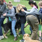 Dann waren die Schüler aber kaum noch zu halten (die Hunde auch nicht), denn dann ging es auf die großen Außenflächen. Hier konnten die Kinder mit den Vierbeinern spielen und sie mit Hilfe von Leckerlis zum Überwinden von Hindernissen bringen.