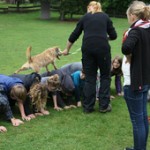 Dass die Hunde kleine Tricks vorführten, beeindruckte die Kinder sehr: sie stellten sich gernbreitbeinig hintereinander, so dass die Hunde durch die Beine flitzen konnten und ließen im Vierfüßlerstand die Tiere über ihre Rücken laufen.