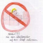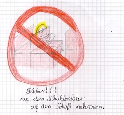 „Am besten fand ich das, als der Polizist erklärte, wo man seinen Tornister im Bus hinstellen soll. Man darf seinen Toni nie auf den Schoß nehmen, weil im Toni immer spitze Gegenstände sind, die bei einer Vollbremsung herausgeschleudert werden und zum Beispiel ins Auge gehen können. Den Toni also immer unten an die Füße oder untern Sitz stellen.“ (Celine)