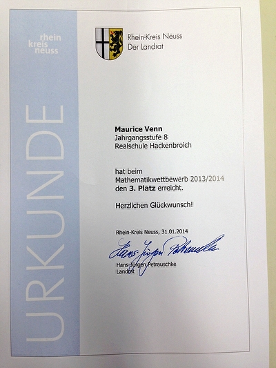 Am 31.1.2014 wurden im Rahmen einer Feierstunde in der Aula des Quirinus-Gymnasiums in Neuss die Preisträger des 26. Mathematikwettbewerbs des Rhein-Kreises Neuss (entspricht der 1. Runde der Mathematik-Olympiade) von Landrat Hans-Jürgen Petrauschke ausgezeichnet. 78 erfolgreiche Mathe-Talente nahmen ihre Urkunden entgegen. Einziger Realschüler war Maurice Venn aus der 8b der Realschule Hackenbroich.