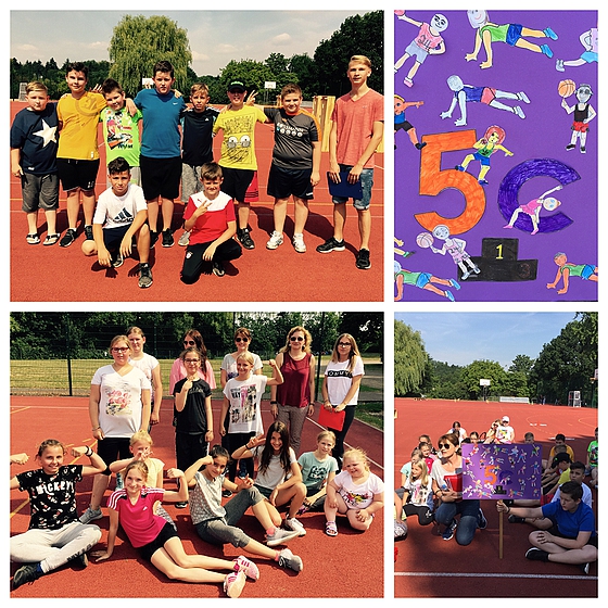Die 5c sammelte die meisten Punkte (31) und machte zum Schluss mit den Siegen in der Staffel, sowohl bei den Mädchen als auch bei den Jungen, den Sieg klar. Bei der Siegerehrung präsentierten sie noch einmal ihr sehr schön gelungenes Klassenschild. Schon beim „olympischen Einmarsch“ sorgten die Fünferklassen für Stimmung und ein buntes Bild, denn auch die 5a und 5b hatten fantasievolle Schilder gebastelt. Als Zweite durfte die 5b das Siegerpodest betreten (28 Punkte), die 5a belegte den ehrenvollen dritten Platz (26 Punkte). Alle Klassen wurden dann für ihren sportlichen Ehrgeiz und ihren Einsatz belohnt und erhielten die berühmten „Leckerli“-Tüten.