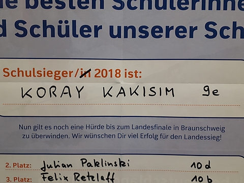 Der diesjährige Schulsieger des Geographie-Wettbewerbs heißt Koray Kakisim. Er geht in die Klasse 9e und hat damit die Konkurrenz aus den darüber liegenden 10er-Klassen hinter sich gelassen.