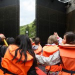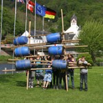 Die Kinder mussten auch in Gruppen planen und Lösungsmodelle umsetzen zum Problem: wie baut man aus Plastikfässern, Holzpfählen und Seilen ein seetüchtiges Floß? Hierbei entstanden interessante Kreationen, und wer mutig war, unterwarf diese einem Selbstversuch auf der Lahn – bei 16 Grad Wassertemperatur. Das war ein munteres Plantschen und Kreischen! Denn nicht alle Modelle überstanden den Wassergang.