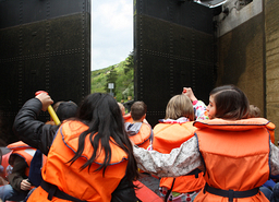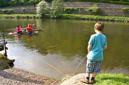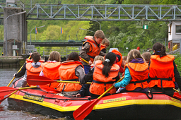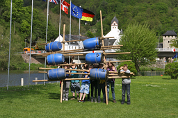 Die Kinder mussten auch in Gruppen planen und Lösungsmodelle umsetzen zum Problem: wie baut man aus Plastikfässern, Holzpfählen und Seilen ein seetüchtiges Floß? Hierbei entstanden interessante Kreationen, und wer mutig war, unterwarf diese einem Selbstversuch auf der Lahn – bei 16 Grad Wassertemperatur. Das war ein munteres Plantschen und Kreischen! Denn nicht alle Modelle überstanden den Wassergang.