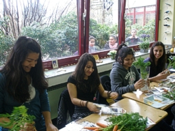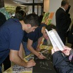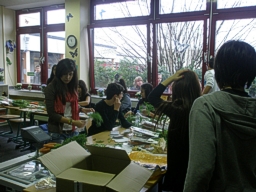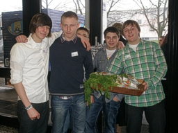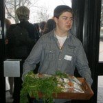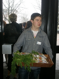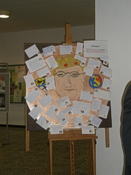 Vorbereitet haben wir das Event mit Hilfe von Frau Fernhomberg von „Stärken vor Ort“ (Stadt Dormagen) und Herrn Müller-Breuer (Jugendmigrationsdienst für den Rhein-Kreis Neuss), dem wiederum der Mediengestalter Willi Kühl beim Aufhängen der Bilder geholfen hat… Holztafeln mit einer Riesenmöhre resp. dem Konterfei unseres Bürgermeisters waren in Kooperation zwischen Frau Roloff, Herrn Artz und Herrn Müser entstanden. Geduldig Möhre für Möhre und Taler für Taler in die Tütchen versenkt haben SchülerInnen der 8. und 10. Klassen.
