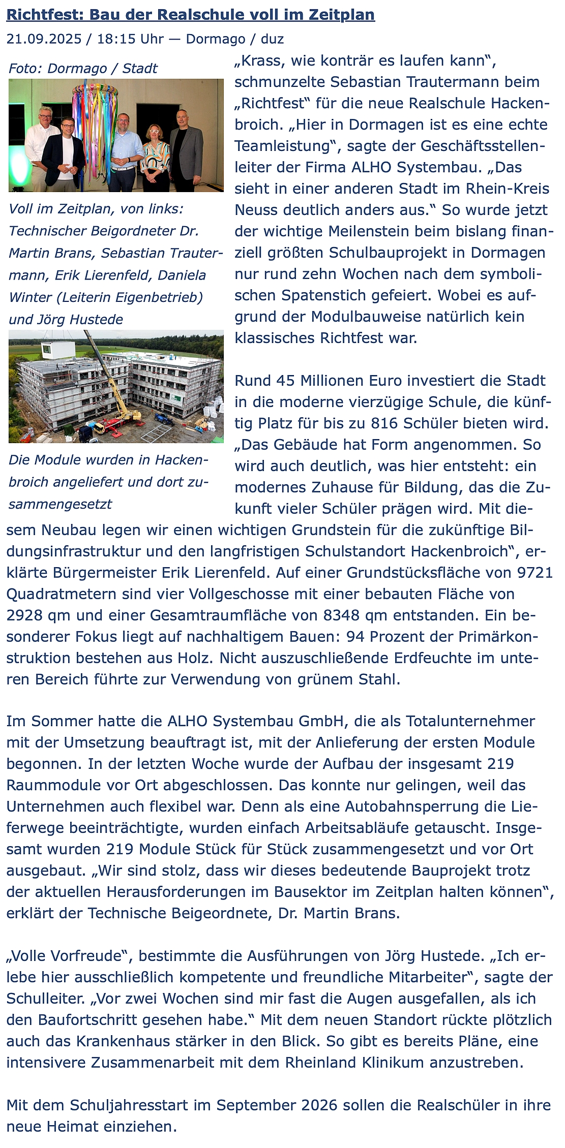 Richtfest: Bau der Realschule voll im Zeitplan Quelle: Dormago vom 21.09.2025 Webmaster2025-09-21T20:24:50+02:0021. September 2025|
