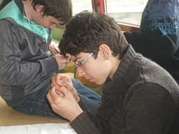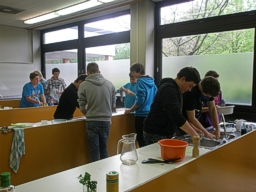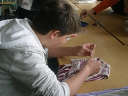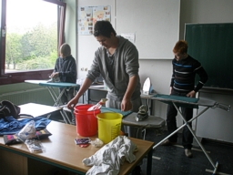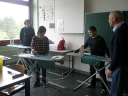 Während die eine Gruppe in der Küche eine Mahlzeit zubereitete und den Tisch mit Servietten dekorierte, waren andere mit Rollenspielen zum Thema „Typisch männlich, typisch weiblich?“ beschäftigt oder wurden in die Geheimnisse des Bügelns, Fensterputzens und Knöpfchen Annähens eingeweiht. Dabei war auch manch ein Pflaster nötig. Originalton Herr Müser: „Du musst den Knopf an den Stoff nähen, nicht an Deinen Daumen!“ Die meisten Schüler waren an ihrem Boys‘ Day mit Feuereifer bei der Sache und freuten sich am Ende über ihren Haushalts-Pass.