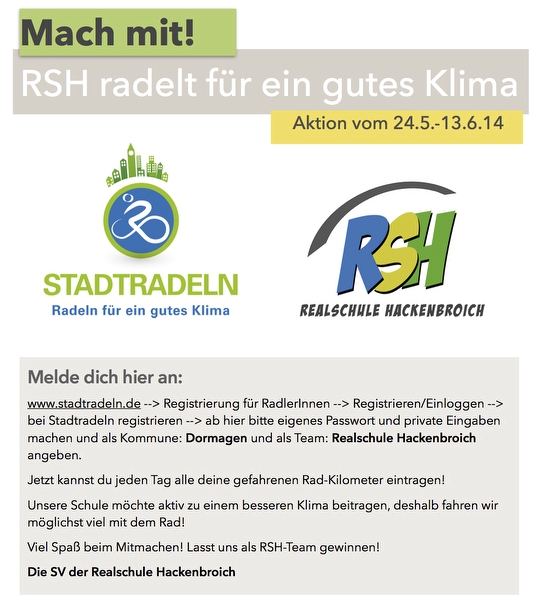RSH radelt für ein gutes Klima Unsere Schule möchte aktiv zu einem besseren Klima beitragen, deshalb fahren wir möglichst viel mit dem Rad und machen bei der Kampagne STADTRADELN mit. Webmaster2014-05-29T22:56:39+02:0029. Mai 2014|
