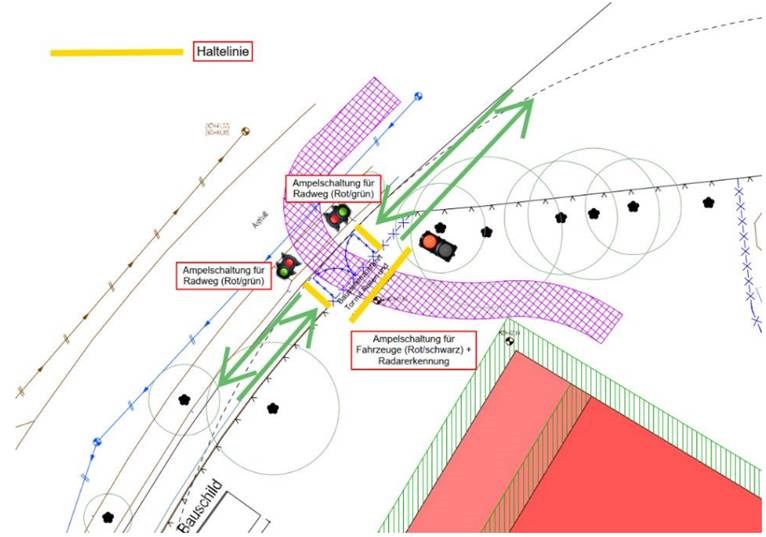 - Es wird eine Ampel (Rot/Grün – Schaltung) für den Radweg eingerichtet. Eine zusätzliche Ampel (Rot/Schwarz – Schaltung) wird an der Baustellenausfahrt installiert, die durch einen Radarbewegungsmelder aktiviert wird.