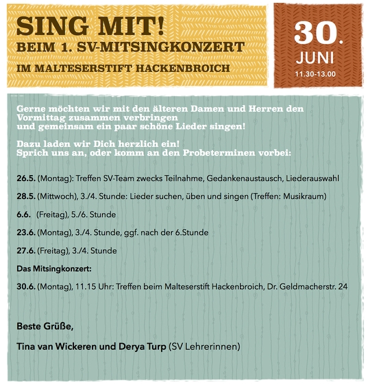 Sing mit! – beim 1. SV-Mitsingkonzert Gerne möchten wir mit den älteren Damen und Herren den Vormittag zusammen verbringen und gemeinsam ein paar schöne Lieder singen! Dazu laden wir Dich herzlich ein! Sprich uns an, oder komm an den Probeterminen vorbei! Webmaster2014-05-29T22:56:07+02:0029. Mai 2014|