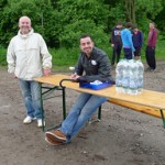 Auch wenn Regenschirme und Kapuzen öfter mal zum Einsatz kamen, war die gute Laune aller Beteiligten ungetrübt. Die Streckenposten aus den 10. Klassen genossen die frische Waldluft und zeigten zuverlässig, wo es lang ging. Die Helfer des Sanitätsdienstes standen immer dort bereit, wo ein Pflaster oder auch nur Zuspruch notwendig wurde. In der Sporthalle sorgten die Gruppencoaches für unterhaltsame Betreuung der Kinder, die auf den Schulbus warten mussten. Eltern und Lehrer verpflegten die Kinder großzügig mit frisch zubereitetem Obst und Getränken. Prima, dass sie dabei sitzen konnten. Bänke und Tische hatte die Familie Koch bei der Feuerwehr in Rommerskirchen leihen dürfen und auch an Ort und Stelle auf- und abgebaut.