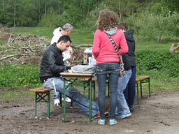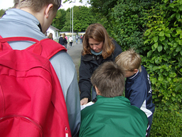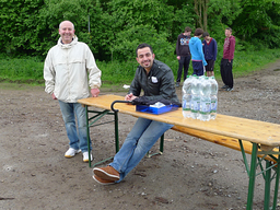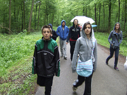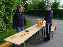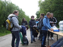 Auch wenn Regenschirme und Kapuzen öfter mal zum Einsatz kamen, war die gute Laune aller Beteiligten ungetrübt. Die Streckenposten aus den 10. Klassen genossen die frische Waldluft und zeigten zuverlässig, wo es lang ging. Die Helfer des Sanitätsdienstes standen immer dort bereit, wo ein Pflaster oder auch nur Zuspruch notwendig wurde. In der Sporthalle sorgten die Gruppencoaches für unterhaltsame Betreuung der Kinder, die auf den Schulbus warten mussten. Eltern und Lehrer verpflegten die Kinder großzügig mit frisch zubereitetem Obst und Getränken. Prima, dass sie dabei sitzen konnten. Bänke und Tische hatte die Familie Koch bei der Feuerwehr in Rommerskirchen leihen dürfen und auch an Ort und Stelle auf- und abgebaut.