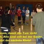 Die Fünfer bekamen nämlich Aufgaben, die sie gemeinsam als Klasse lösen sollten. Diese Spiele oder Aufgaben funktionierten nur, wenn alle zusammen hielten. Und wenn man sich nicht gegenseitig unterstützte und motivierte, gab`s nur noch Chaos und alle waren total frustriert. Manche Spiele waren ganz schön schwer und man brauchte unendlich Geduld, aber wenn`s dann am Ende doch fast immer klappte, jubelten alle erleichtert auf. Und warum hat jede Klassen am Ende doch noch die Aufgaben gelöst? Weil sie eingesehen und verstanden haben, dass man bestimmte Regeln braucht, um zu einer Lösung zu kommen und um gemeinsam Spaß haben zu können.