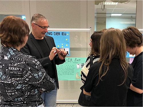Anlässlich des EU-Projekttages durften wir an unserer Schule den Staatssekretär im Ministerium für Schule und Bildung des Landes Nordrhein-Westfalen Dr. Urban Mauer begrüßen. Zusammen mit dem Dezernenten Hans-Martin Rahe und dem 2. stellvertretenden Bürgermeister von Dormagen René Schneider nahm er sich Zeit für die Präsentationsarbeiten zu diversen Themen rund um die EU. So arbeiteten unsere Schüler u.a. daran, das Schengener Abkommen zu verstehen und die Bedeutung des Klimaschutzes innerhalb der EU zu durchleuchten. Der Staatssekretär ließ es sich nicht nehmen, jedes Plakat zu sichten und dabei mit unseren Schülern ins Gespräch zu kommen.