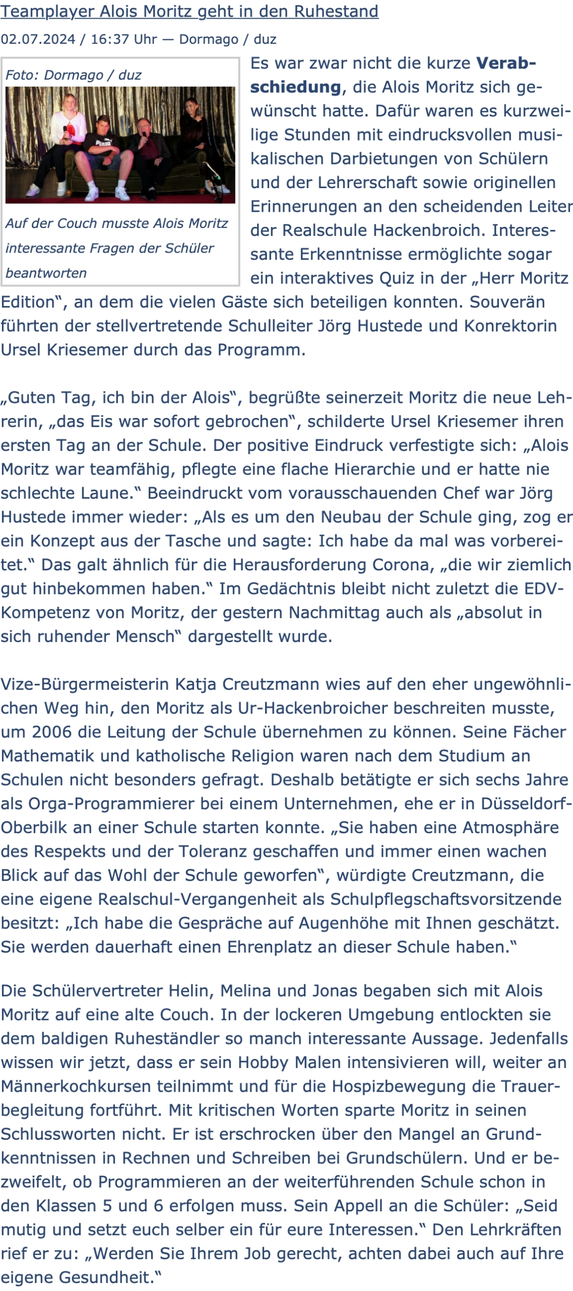 Teamplayer Alois Moritz geht in den Ruhestand Quelle: Dormago vom 02.07.2024 Webmaster2024-07-07T18:09:44+02:007. Juli 2024|