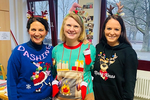Bei den Lehrern konnte sich Frau Heiland knapp durchsetzen mit ihrem Activity-Weihnachtspullover, der mit liebevollen Details erweitert und verändert werden konnte und so immer neu zu überraschen wusste.