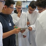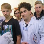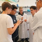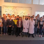 Bis dahin ist es aber zunächst ein weiter Weg, der für viele ungewohnt früh um 6.45 Uhr am Bahnhof Dormagen beginnt. Erfreulicherweise sind alle Schüler und Schülerinnen des Wahlpflichtkurses Chemie pünktlich und haben gute Laune. Nach Anreise mit öffentlichen Verkehrsmitteln betreten wir um 8.45 Uhr das Schülerlabor. Nach einer kurzen Einführung und einem Rundgang durch die Räumlichkeiten geht es an die Arbeit. Schnell müssen sich die Schüler und Schülerinnen für verschiedene Arbeitsgruppen entscheiden und ihre Ergebnisse den anderen schon bald in einer ersten Präsentationsrunde vorstellen. Der Zeitdruck und die Einsicht, dass bestimmte Arbeitsabläufe ineinander greifen, um am Ende zu einem Ergebnis zu kommen, werden die Schüler und Schülerinnen den ganzen Tag über begleiten. Ihnen zur Seite stehen geschulte Mitarbeiter, die Fragen beantworten, sich aber ansonsten zurückhalten.